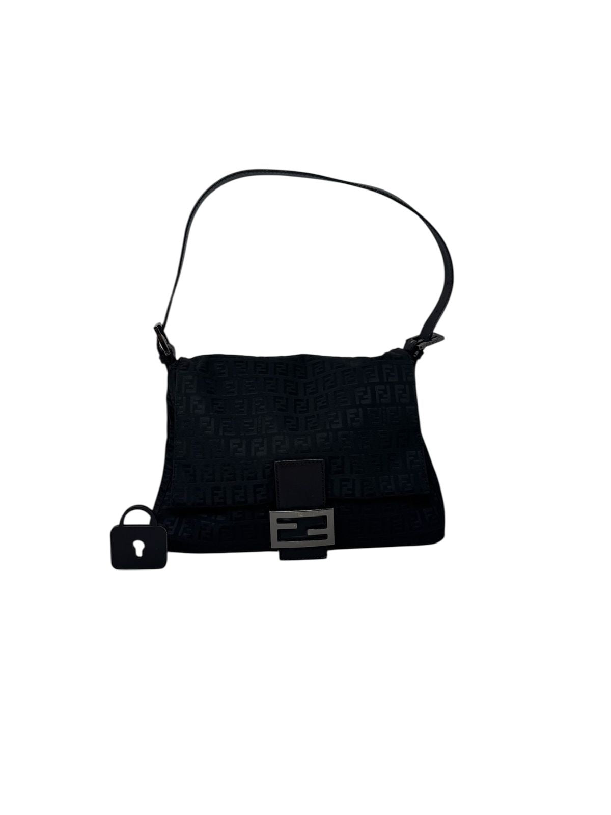 Elaborada en textil zucca color negro. Herrajes plateados. Asa corta para llevar en la mano y al hombro. Medidas: 20/19/11 cms. Muy buen estado, herraje rayado. Accesorios: cubrepolvo.