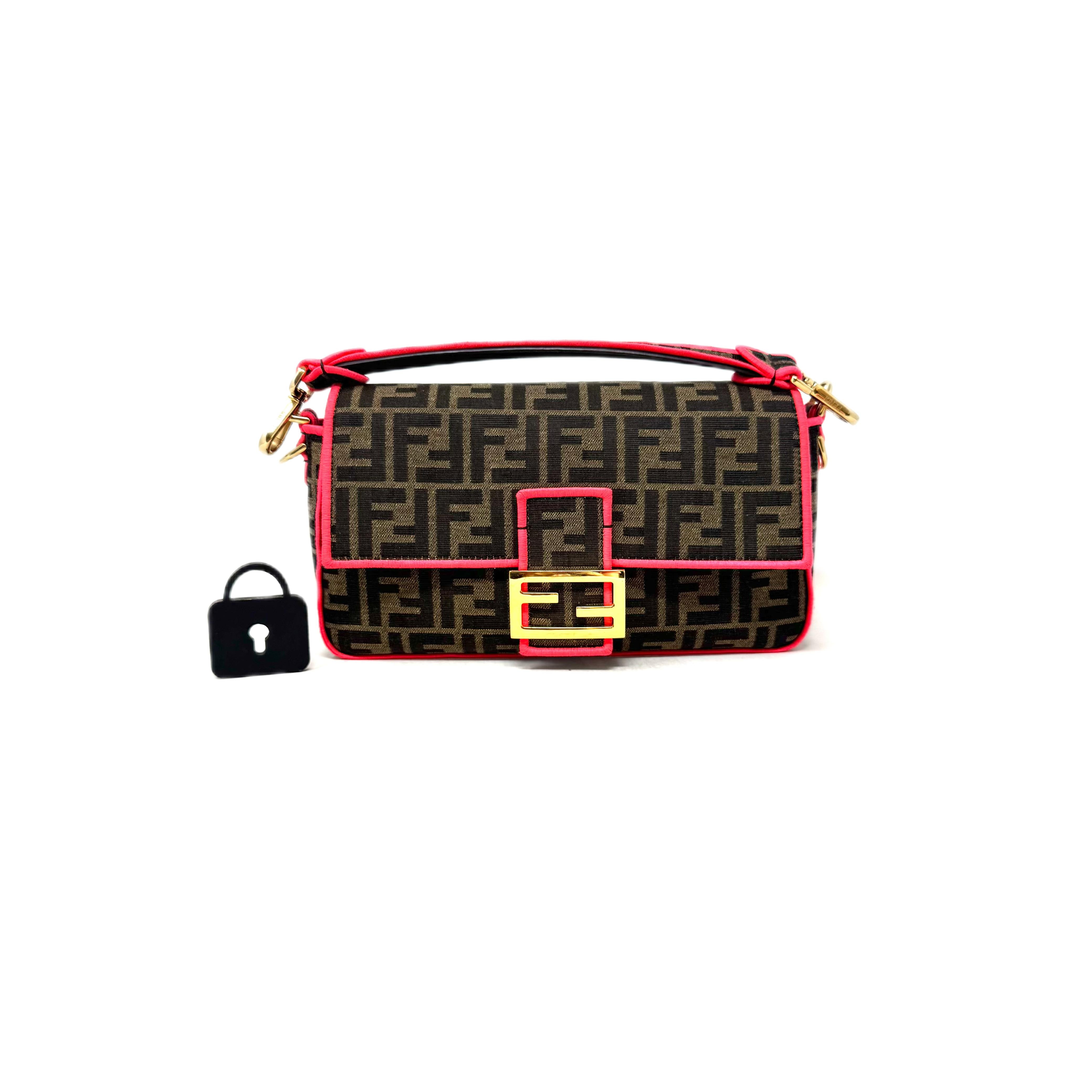 Elaborada en el tradicional zucca de la marca. Bordes en color rosa. Asa corta para llevar en mano. Strap largo bordado en color rosa. Herrajes dorados.