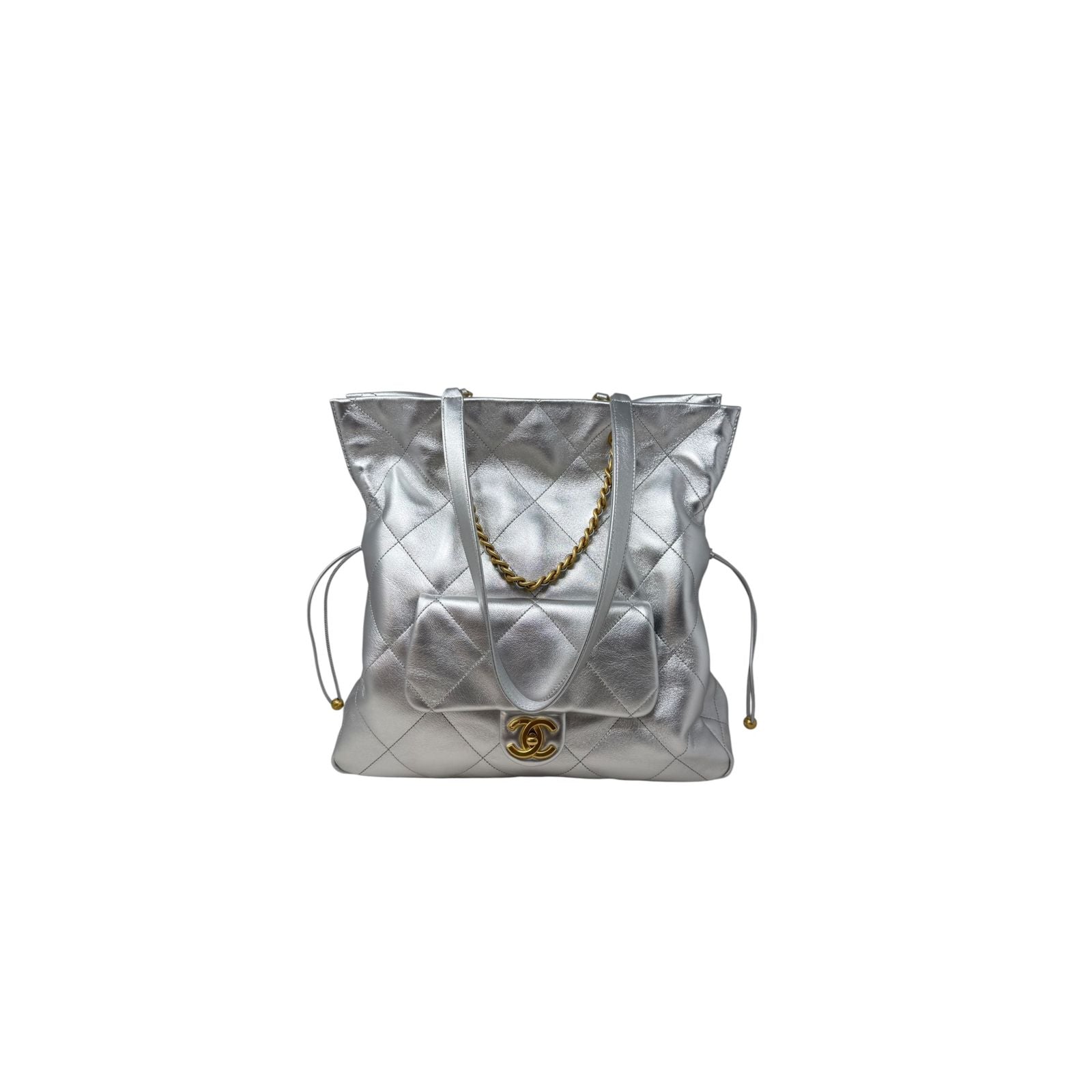 Elaborada en piel plateada. Herrajes dorados. Cadena corta para llevar en la mano. Correa para llevar al hombro. Medidas: 35x35x12. Accesorios: cubrepolvo. Nueva, estrénala.