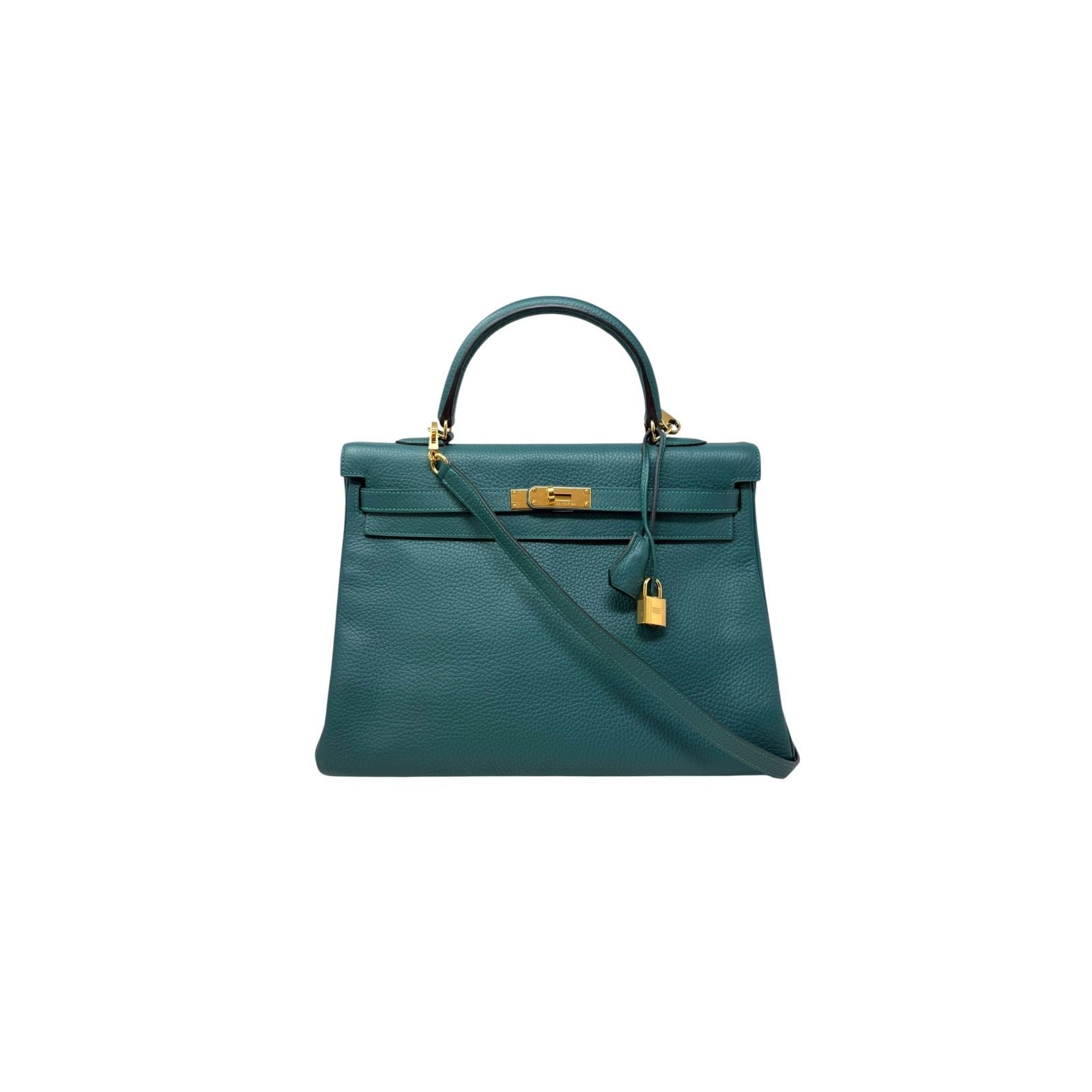 Elaborada en piel Togo. Color Malachite. Herrajes dorados. Medidas: 35x24x12. Muy buen estado. Con cubrepolvo, llaves y clochette. Año 2013.