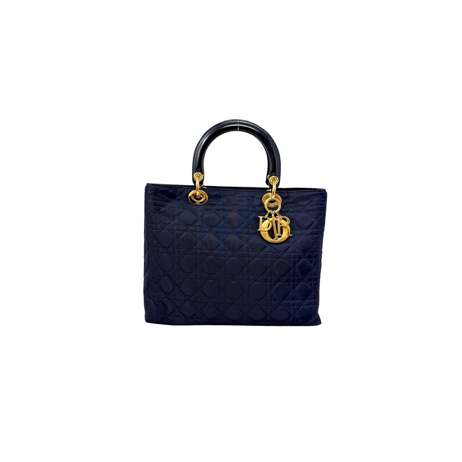 Elaborada en textil color azul marino. Herrajes dorados. Dos asas cortas para llevar en la mano. Medidas: 31x25x11. Sin accesorios. Buen estado.