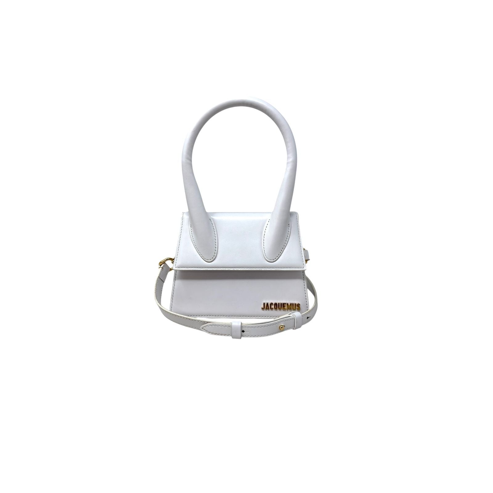 Elaborada en piel blanca. Herrajes dorados. Asa corta para llevar en la mano. Strap largo para usar crossbody o al hombro. Medidas: 18x13x8. Muy buen estado, desgaste en esquinas.
