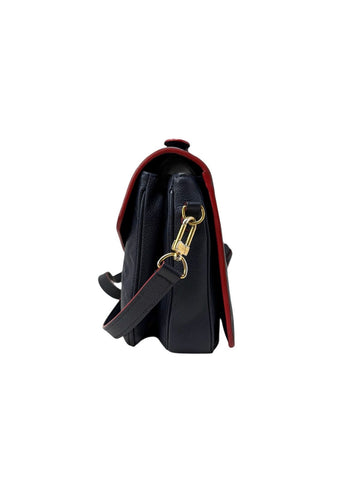 Dos asas para llevar en mano. Strap largo para llevar tipo crossbody. Interior en suede beige. Herrajes dorados.