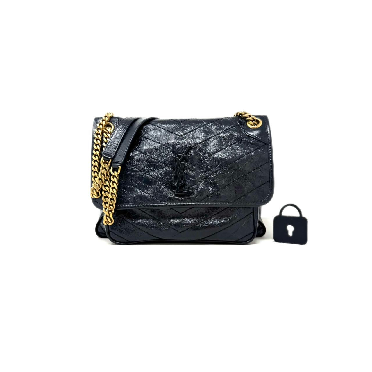 Elaborada en piel color negro. Logo al frente a tono. Herrajes dorados. Cadena larga ajustable para llevar al hombro o tipo crossbody.