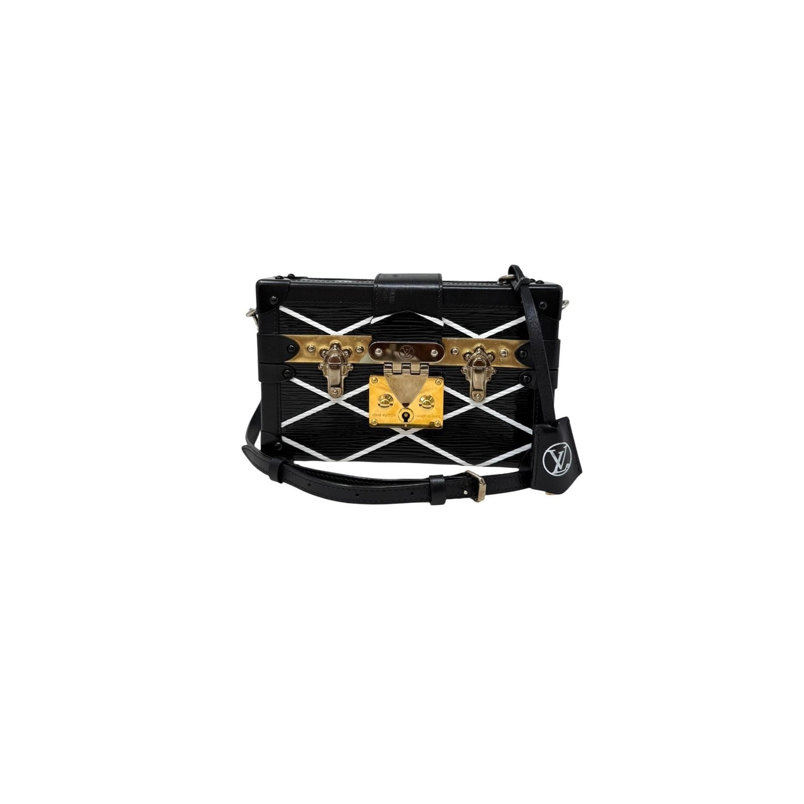 Elaborada en color negro. Con detalles en blanco. Herrajes dorados. Correa larga para usar crossbody o al hombro. Medidas: 19x12x5. Accesorios: cubrepolvo. Buen estado, desgaste en esquinas y en herrajes en general.