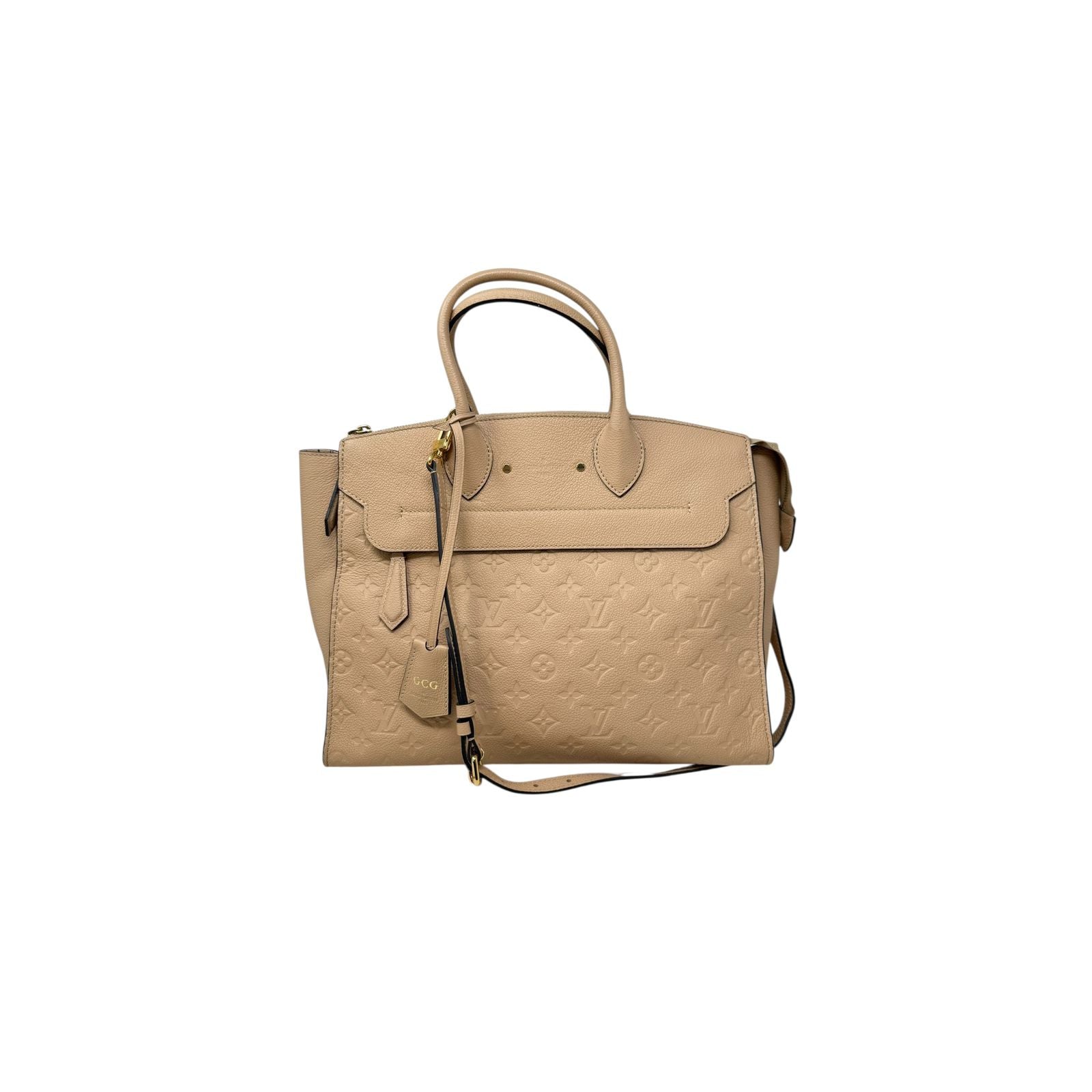 Elaborada en piel Empreinte color nude con el Monogram de la marca. Herrajes dorados. Dos asas cortas para llevar en la mano. Strap largo para usar crossbody o al hombro. Medidas: 35x27x15. Accesorios: cubrepolvo. Tag personalizado con iniciales: GCG. Muy buen estado.