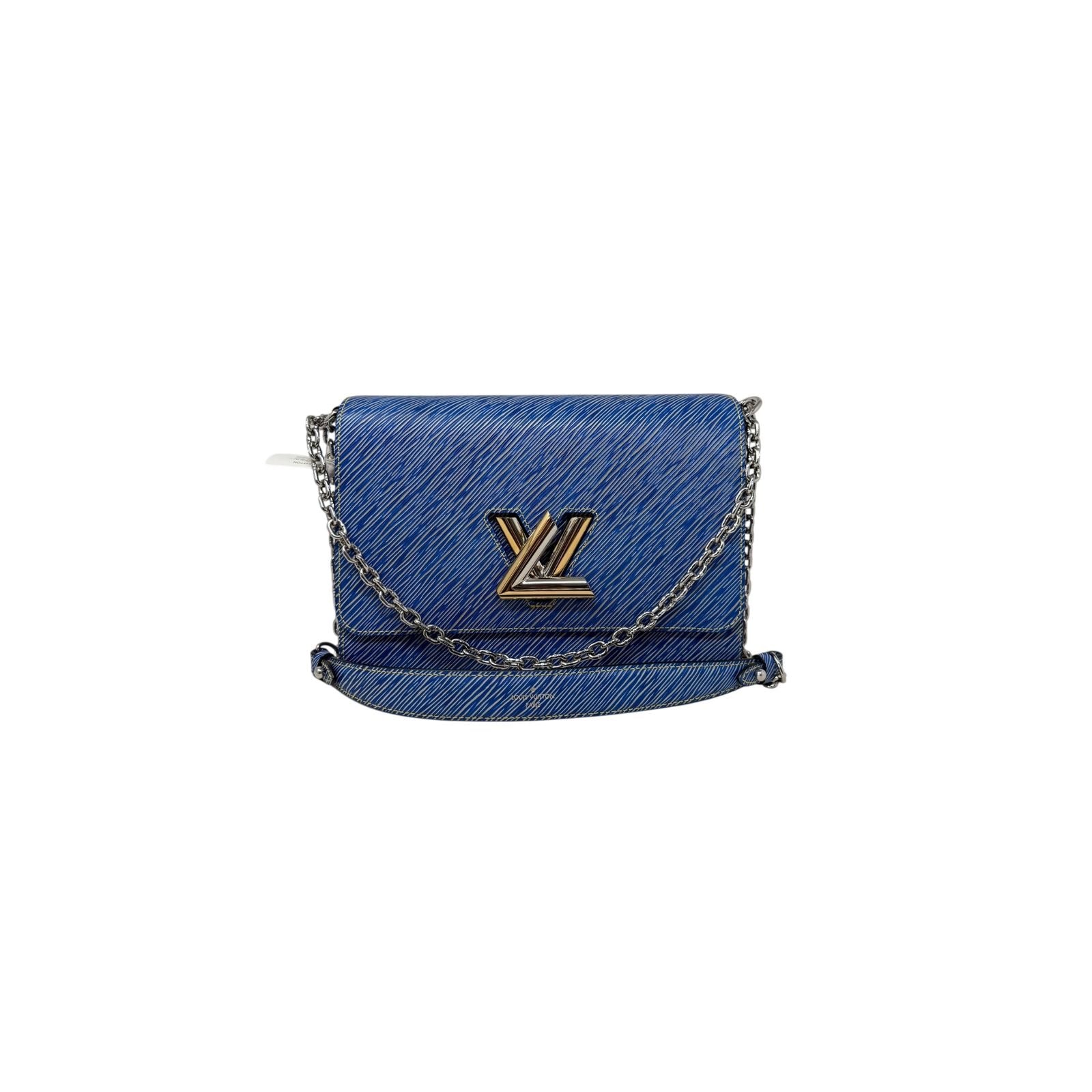 Elaborada en piel Epi color azul. Herrajes plateados. Cadena larga para usar crossbody o al hombro. Medidas: 27x19x10. Accesorios: cubrepolvo. En excelente estado.