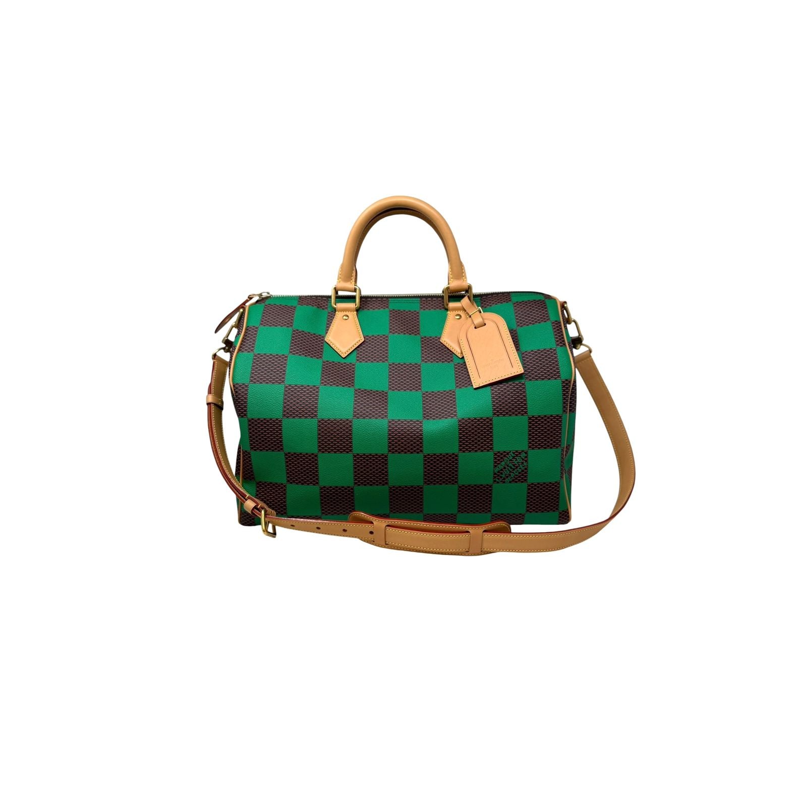 De los diseños de Pharrell. Elaborada en el damier de la marca. Herrajes dorados. Dos asas cortas para llevar en la mano. Strap largo para usar crossbody o al hombro. Medidas: 40x27x23. Accesorios: cubrepolvo. Nueva, estrénala.