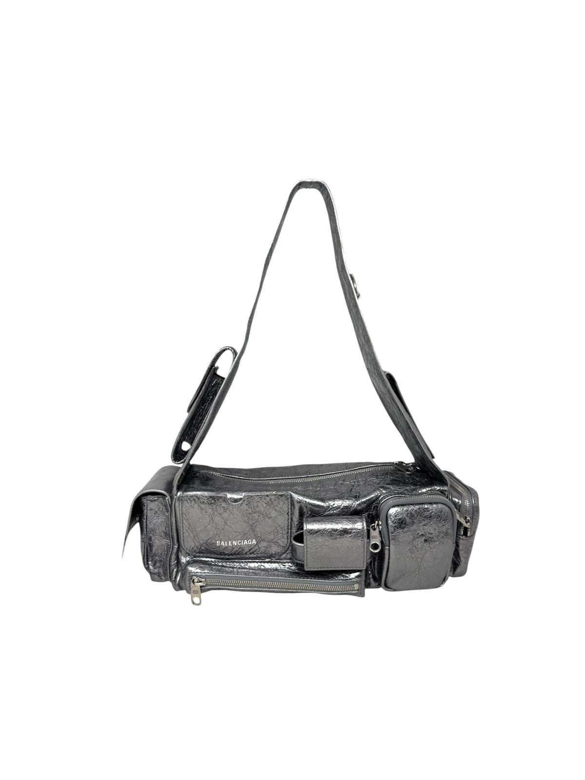 Elaborada en piel color plata con herrajes en plateado con diferentes bolsillos y una asa para llevar al hombro. En muy buenas condiciones. Medidas 31 × 10 × 10 cms. Accesorios cubrepolvo y libro de cuidados. Precio en tienda $50,500