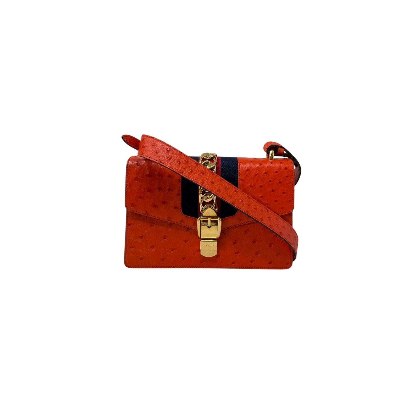 Elaborada en piel naranja de avestruz. Herrajes dorados. Correa larga para usar al hombro. Medidas: 25x17x6. Muy buen estado.