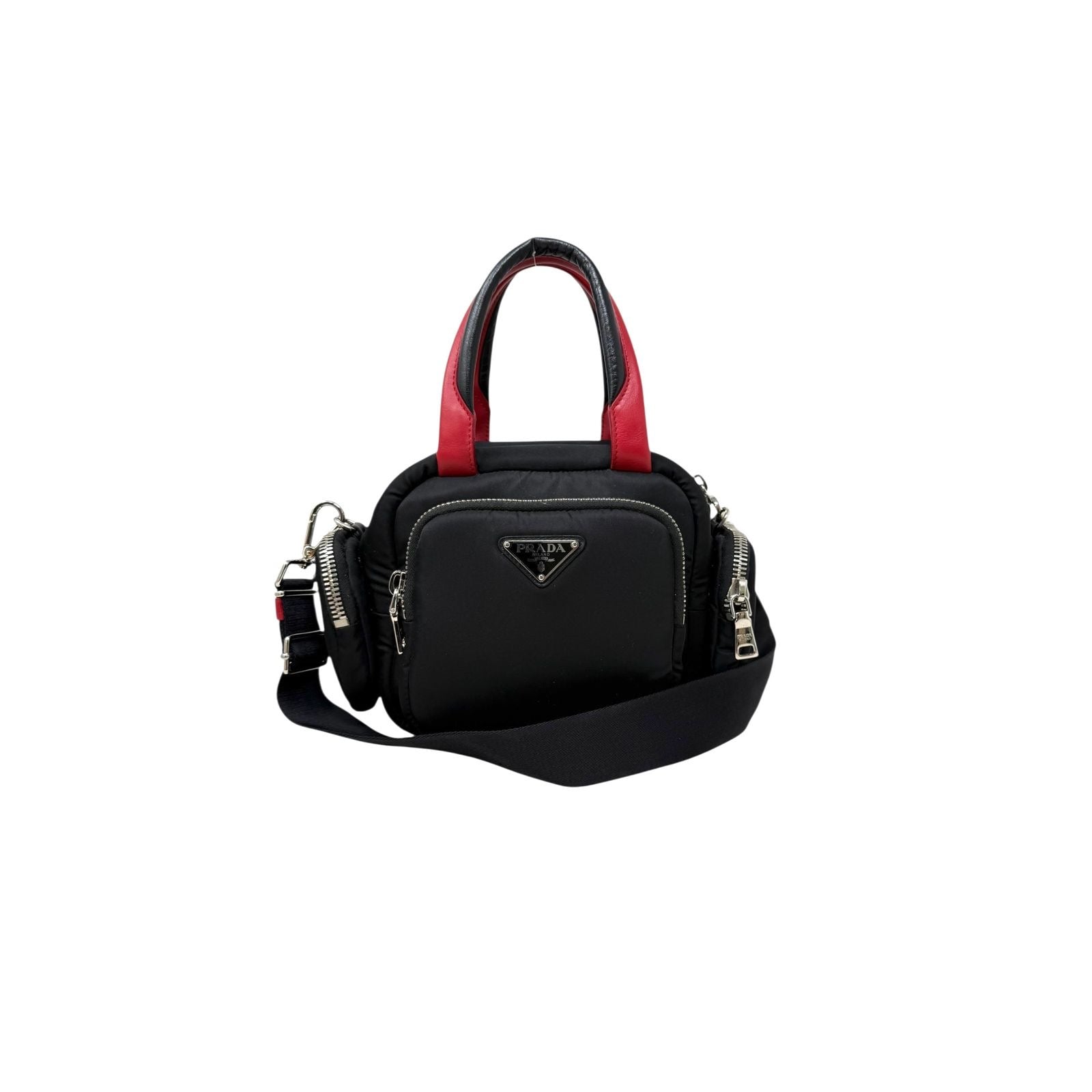Elaborada en Nylon color negro. Detalles en piel roja. Herrajes plateados. Medidas: 20x18x10. Muy buen estado.