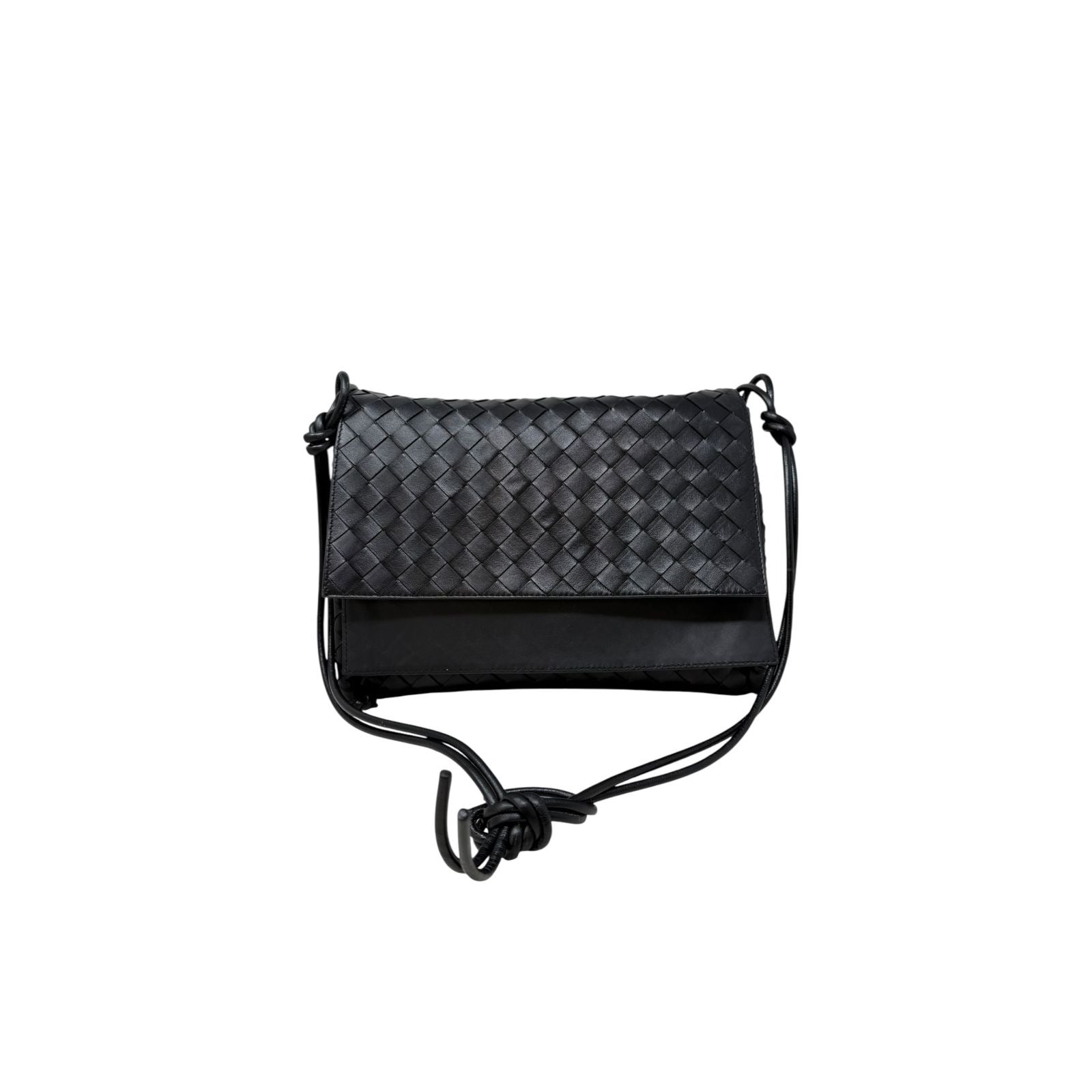 Elaborada en piel negra. Con el Intrecciato de la marca. Cordón largo para usar crossbody o al hombro. Medidas: 30x23x10. Accesorios: cubrepolvo. Muy buen estado, interior ligeramente sucio.