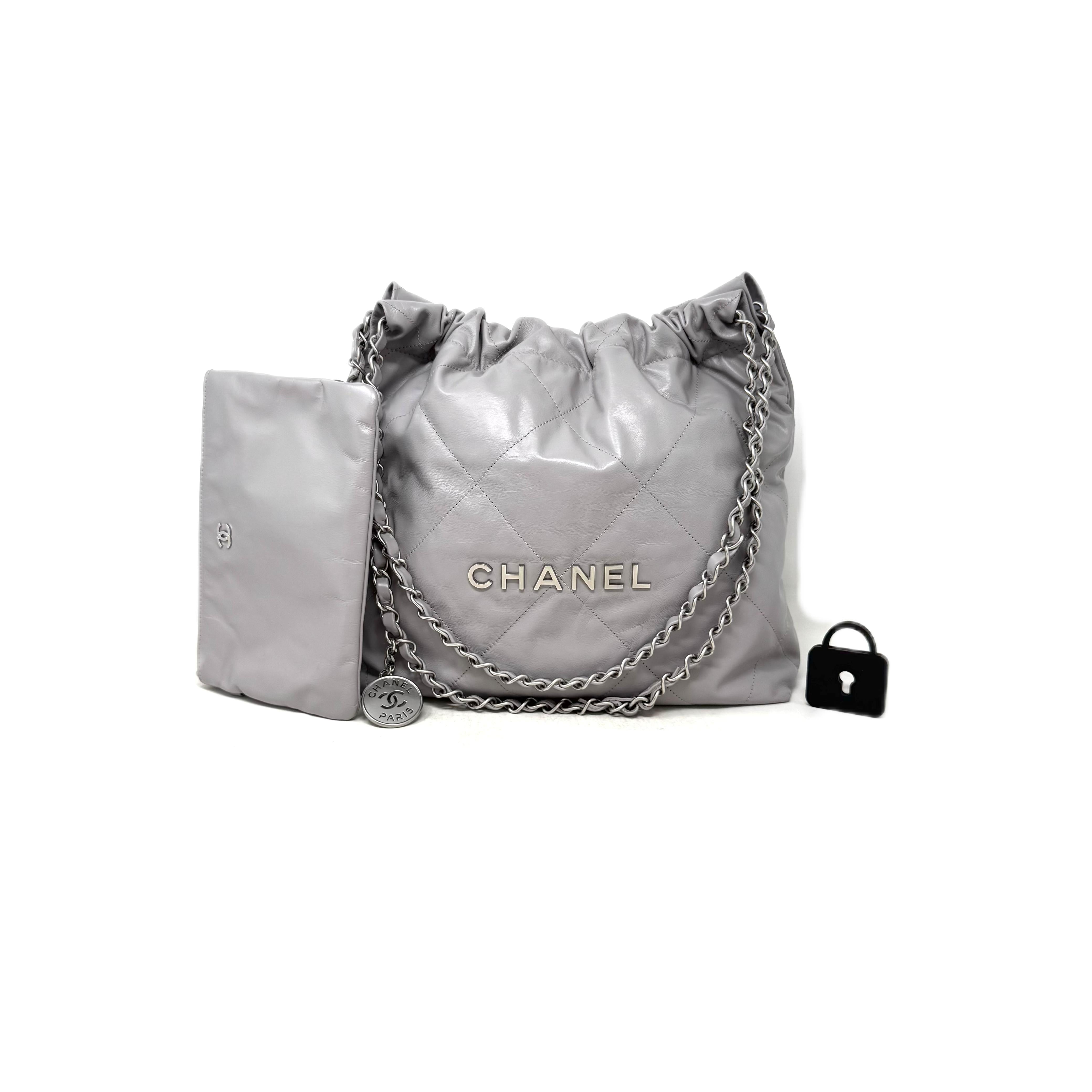 Elaborada en piel lambskin gris. Herrajes plateados. Cadena larga para llevar al hombro. Incluye pochette con zíper.