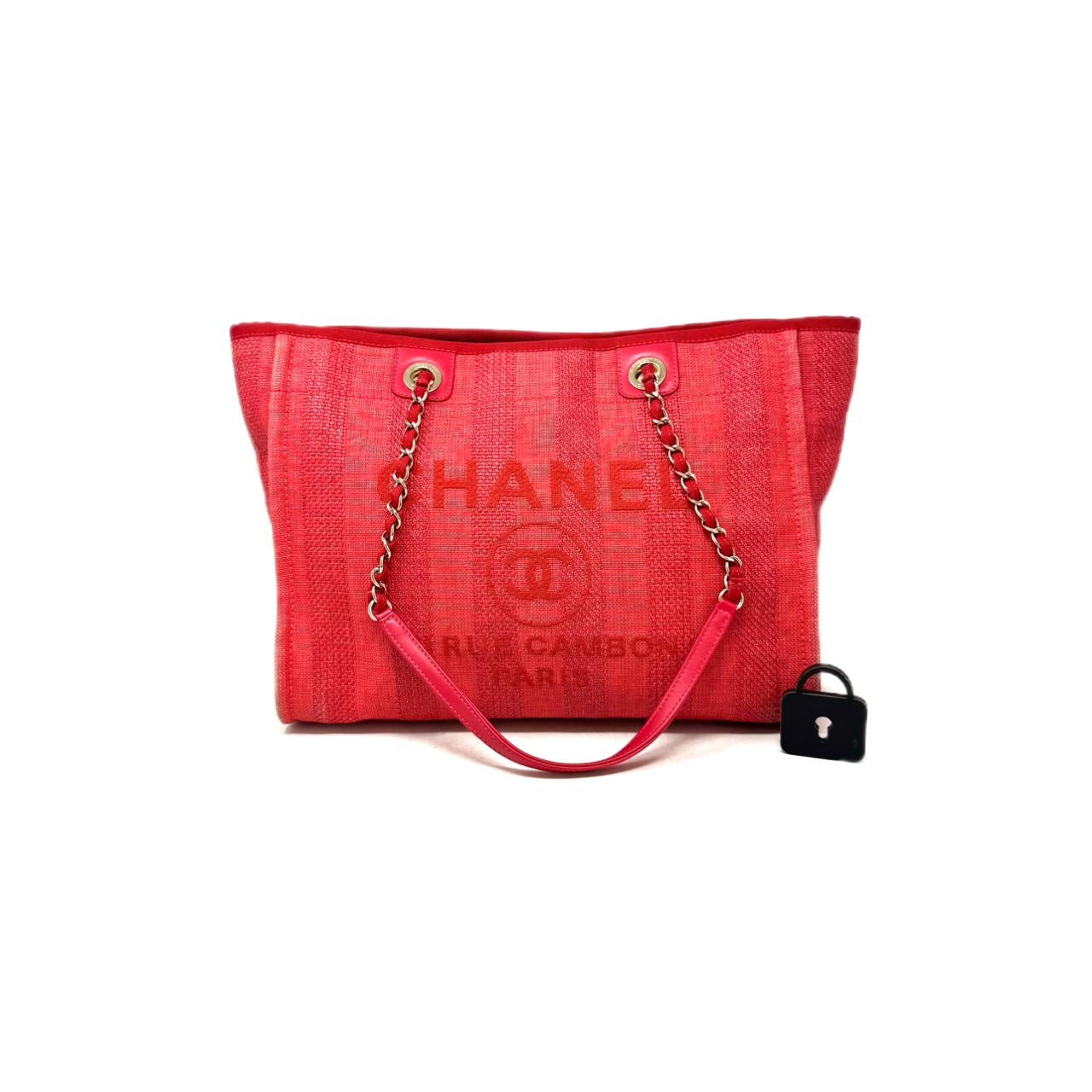 Elaborada en textil rojo. Con nombre y leyenda de la marca a tono. Herrajes dorados. Cadena para llevar al