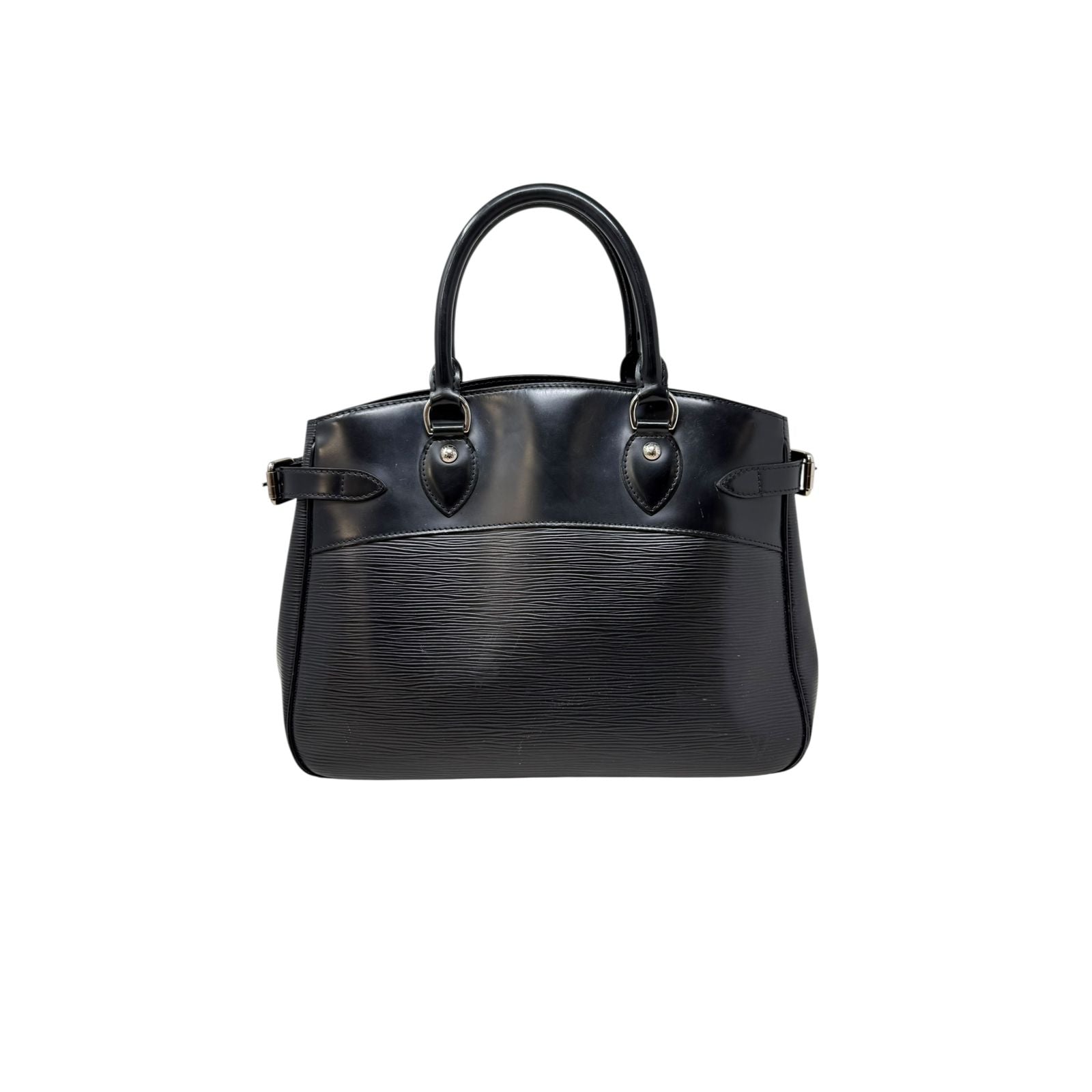 Elaborada en piel Epi color negro. Herrajes plateados. Dos asas cortas para llevar en la mano. Medidas: 33x23x13. Sin accesorios. Buen estado, desgaste en esquinas.