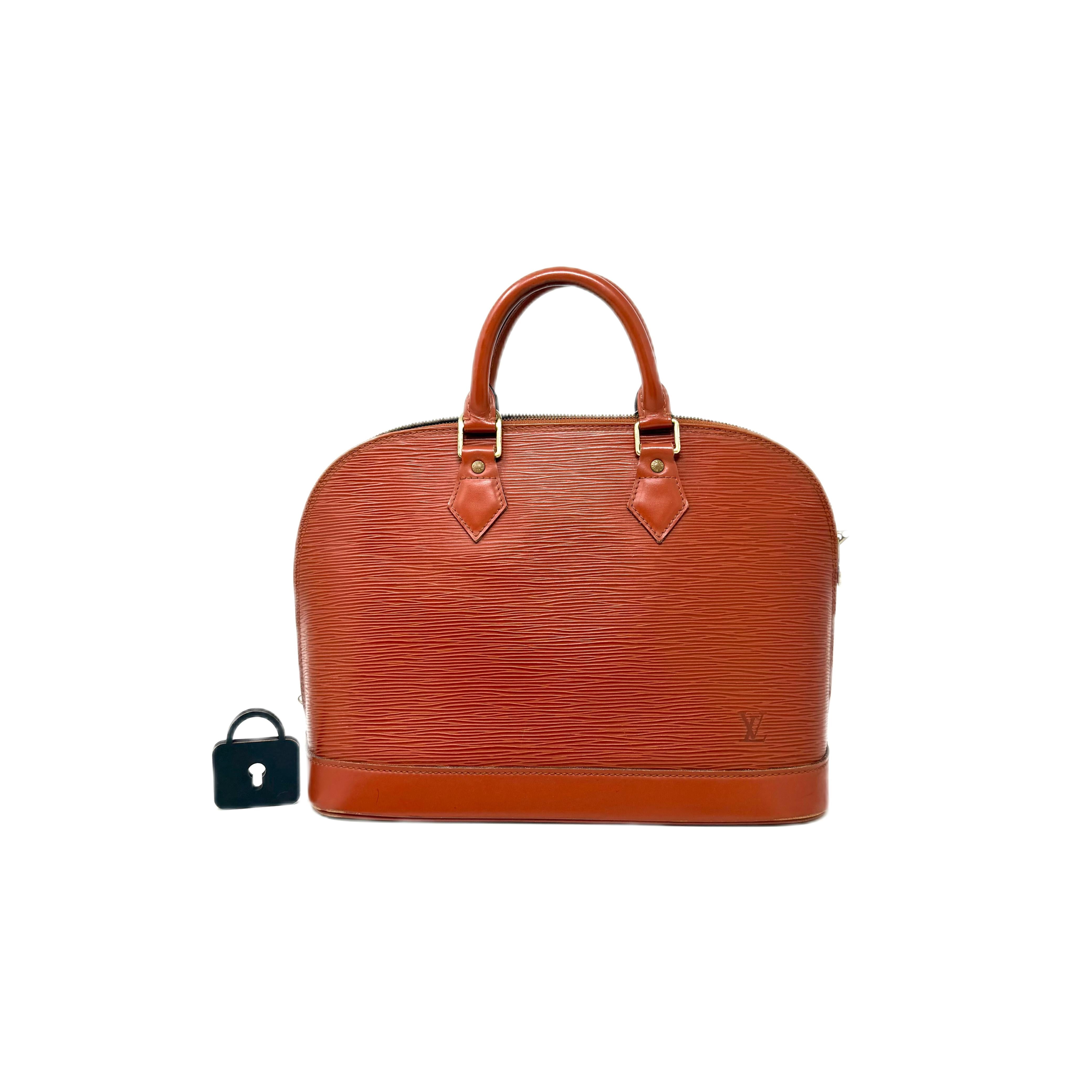 Elaborada en piel epi color ocre. Dos asas para llevar en mano. Cierra con zíper.