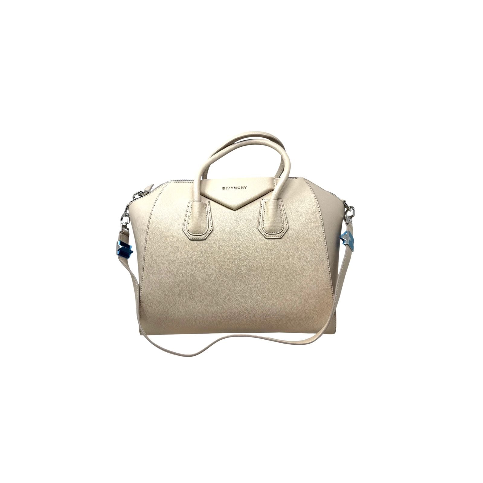 Elaborada en piel Ivory. Herrajes plateados. Dos asas cortas para llevar en la mano. Strap para llevar al hombro. Medidas: 34x29x20. Accesorio: cubrepolvo. Muy buen estado, asas dobladas. Payfast...