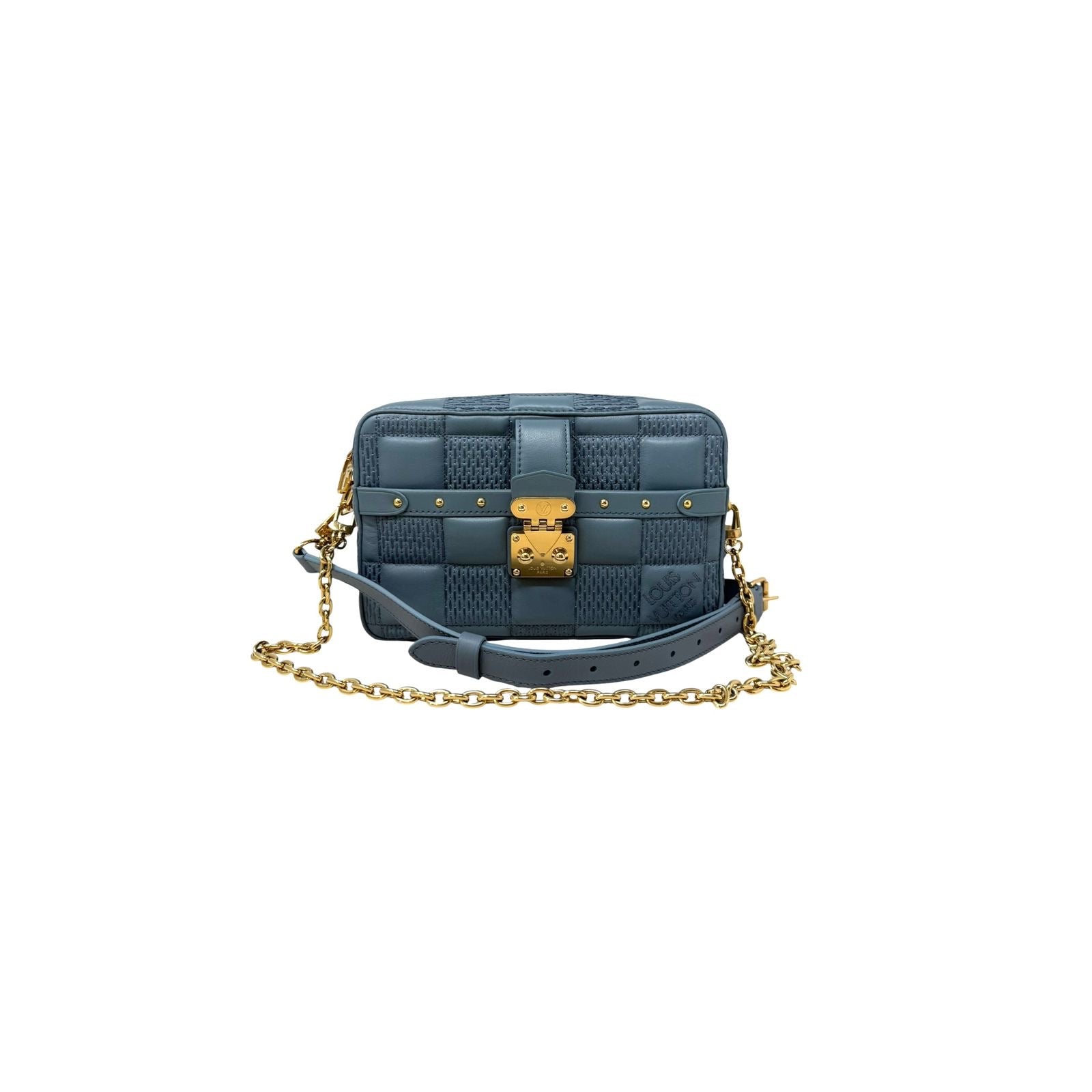Elaborada en piel color azul. Herrajes dorados. Cadena corta para llevar al hombro. Strap largo para usar crossbody. Medidas: 23x15x6. Accesorios: cubrepolvo. En excelente estado.