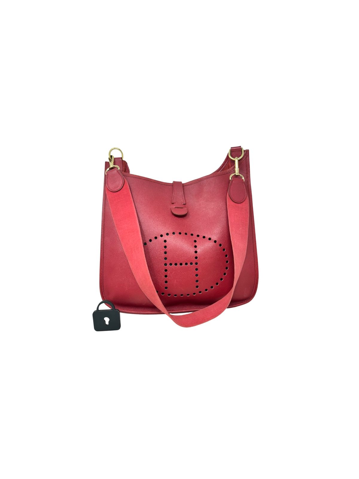 Elaborada en piel color rojo epsom. Herrajes dorados. Medidas: 32/30/9. Strap para llevar al hombro o crossbody. Sin accesorios. Buen estado, estructura relajada y marcas de uso en toda la bolsa (rasguños), y esquinas