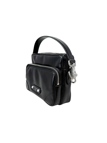 Elaborada en piel azul marino. Herrajes plateados. Dos asas cortas para llevar en la mano. Strap para usar al hombro. Medidas: 42x30x17. Accesorios: cubrepolvo. Buen estado, con piel arrugada en general. Estructura relajada.
