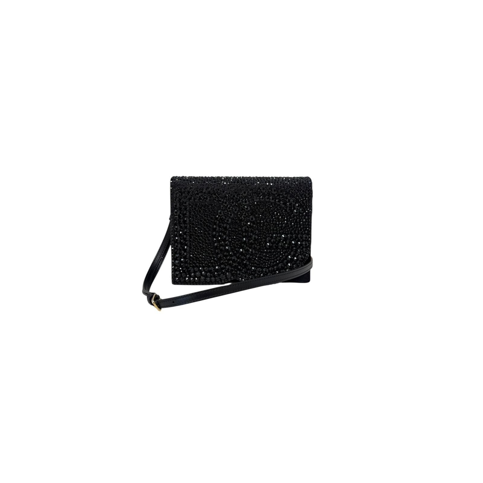 Bolso de solapa elaborada en satén negro con cristales. Iniciales de la marca al frente. Strap ajustable para llevar al hombro o cruzar. Muy buen estado. Medidas 20/15/6. Accesorio...