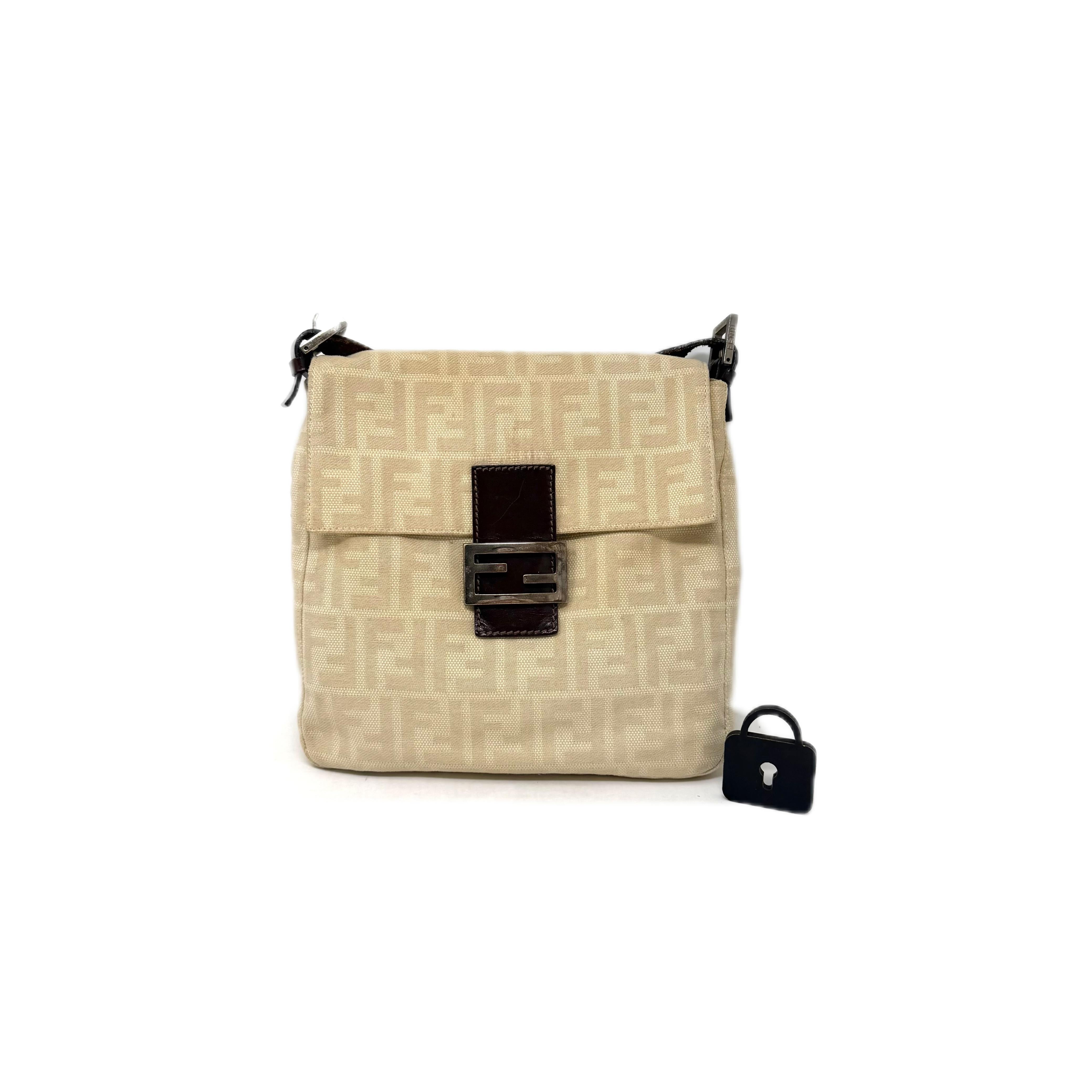 Elaborada en textil color beige claro con el tradicional Zucca de la marca. Herraje al frente. Asa larga para llevar al hombro. Manchas por uso. Herraje oxidado. Buenas condiciones....