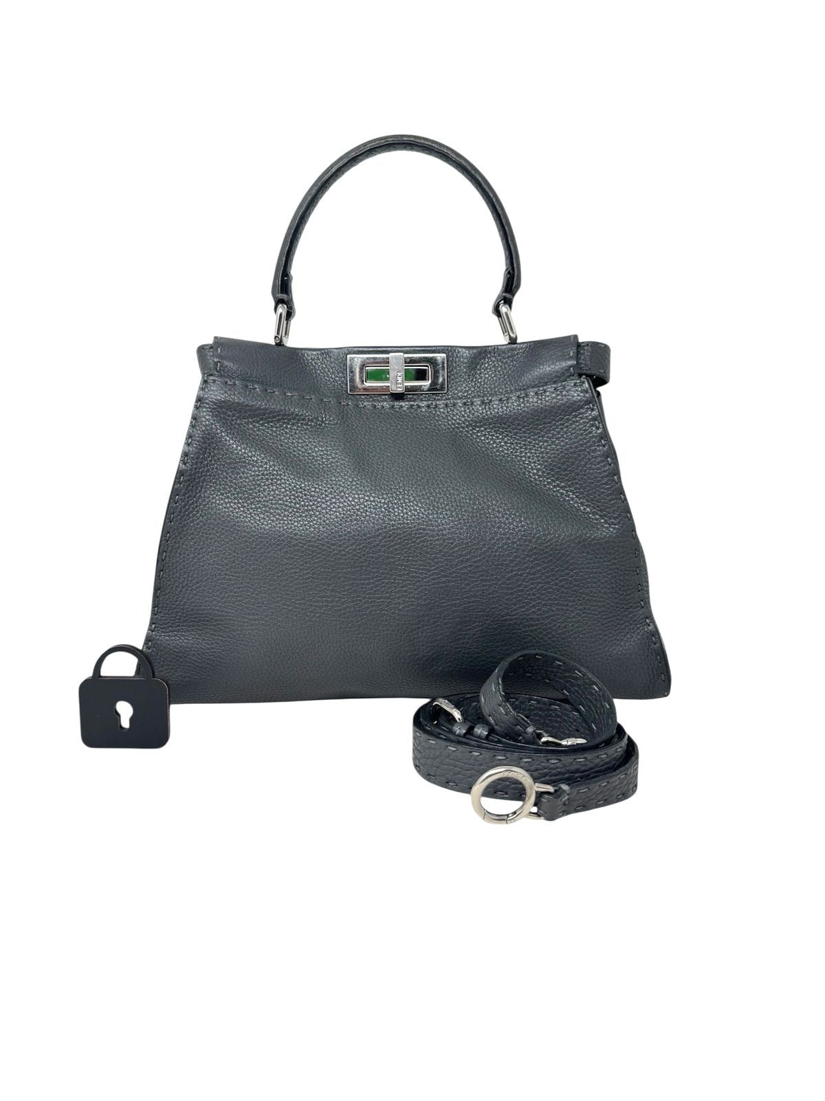 Elaborada en piel gris. Herrajes plateados. Asa corta para llevar en la mano. Strap para llevar crossbody o al hombro. Medidas: 34x26 × 10Cms. Accesorios: cubrepolvo, raincoat y caja....