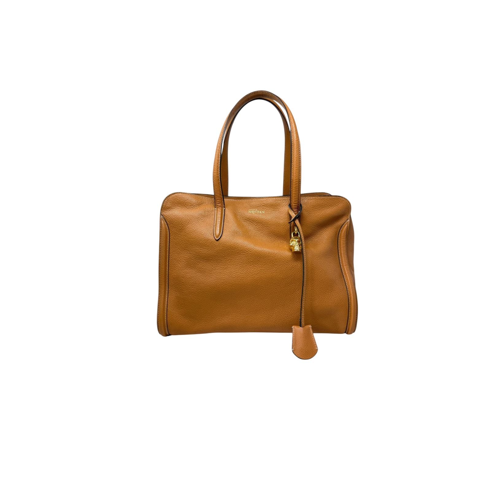 Elaborada en piel café. Herrajes dorados. Dos asas cortas para llevar en la mano o al hombro. Medidas: 37x26x21. Sin accesorios. Muy buen estado.
