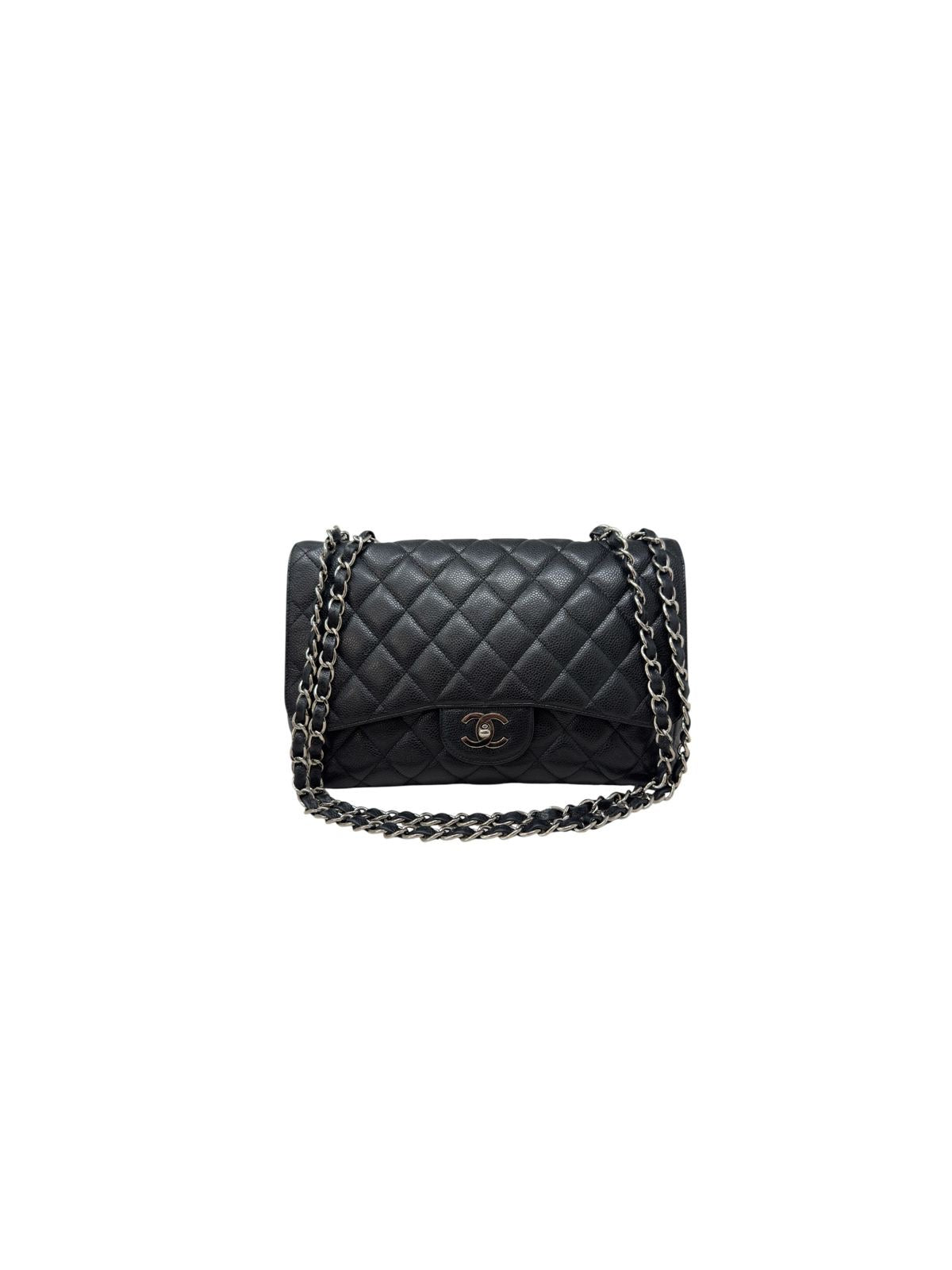 Elaborada en piel caviar color negro. Herrajes plateados. Cadena larga para usar crossbody o al hombro. Medidas: 30x20x9. Buen estado, estructura relajada y desgaste en general. Año 2006.