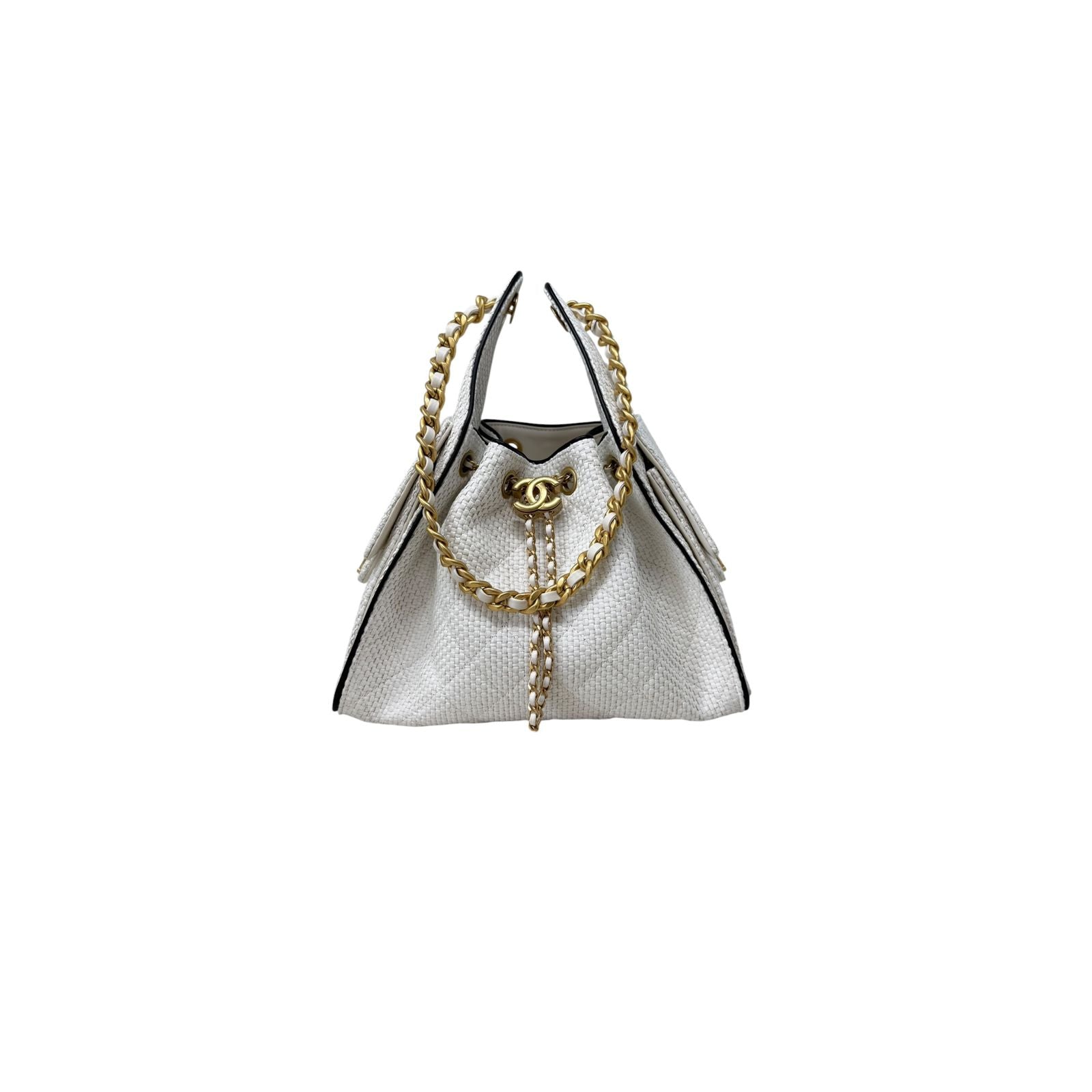 Elaborada en Raffia color blanco. Con bordes en negro. Herrajes dorados. Cadena corta para llevar en la mano o al hombro. Medidas: 26x30x14. Con cubrepolvo. Nueva, estrénala.