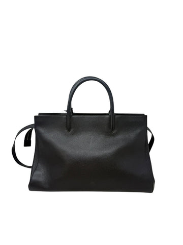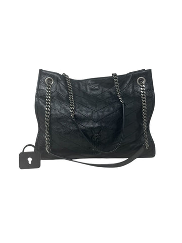 Elaborada en piel negra. Herrajes dorados. Dos asas cortas para llevar en la mano. Buen estado, con desgaste en general. Desgaste en bordes, esquinas y asas. Medidas:30x30x15. Payfast con...