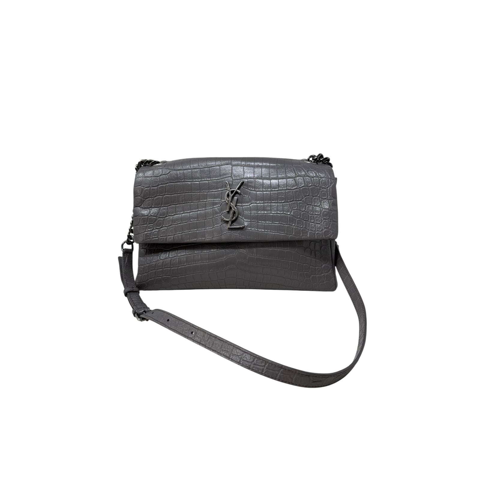 Elaborada en piel gris. Herrajes plateados. Cadena larga para usar crossbody o al hombro. Medidas: 28x18x10. Muy buen estado, ligero desgaste en esquinas.